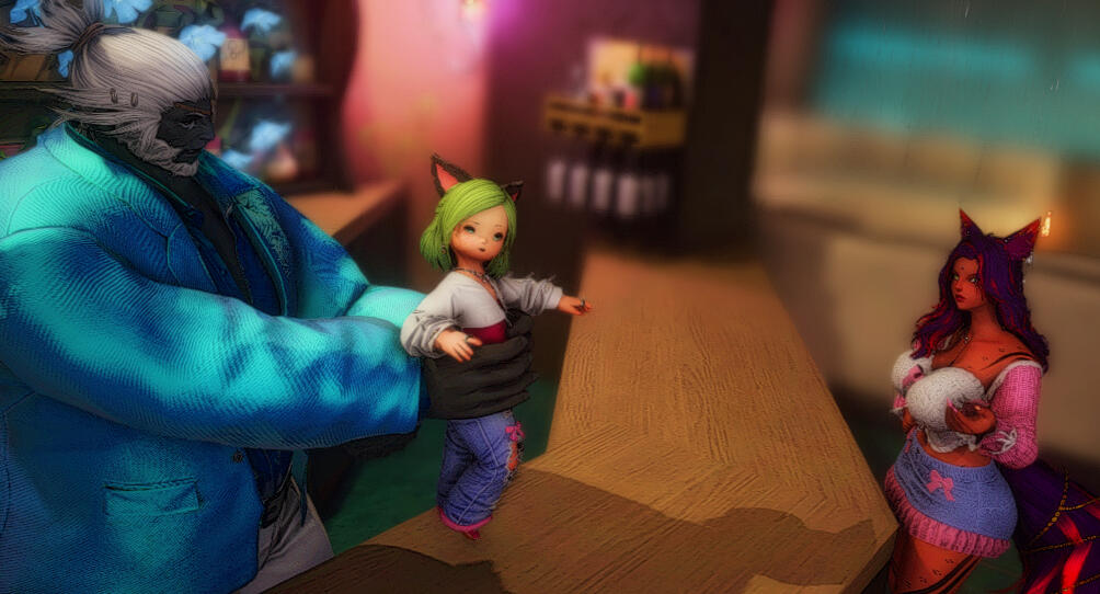 Spoiler warning for post dawntrail patch content “Living Memory” questline!!!Charley pulled herself up onto the crumbling remnants of the wall with a grunt and sat, long legs dangling, scanning the dingy street below for stray bots to put down. She slipped the bag of spare parts she'd collected already off, hanging the strap from a hooked piece of rebar and rolled her shoulders. The constant crash of thunder in the distance barely registered anymore, but sometimes a lightning bolt would streak too near and she'd find herself jumping and not knowing why. She fished her regulator out of her pocket, palming it a few times and then absentmindedly fidgeting with it while crystal blue eyes flicked from shadow to shadow seeking prey. Movement caught her attention in the distance, and she craned her neck, squinting, thinking to herself not for the first time if she shouldn't just bite the bullet and retire her glasses in favor of the eye implants the rest of the family used. The glitter of light reflecting off a long metal arm told her the prey she sought was in sight and she shifted, securing the regulator to her temple and giving it a single tap to activate it.Her eyes closed, and she prepared herself for the flood of adrenalin as her body augmented. Just as the tingle began, it subsided and a single blinking alert filled her mind's eye. "Urgent". The neon alert flashed. Annoyance flitted across her upturned face and she acknowledged the alert without reading what it contained. She froze. Every muscle locked and tense as her mind was flooded with memories in quick succession. Flashes of loved ones who'd passed in the recent battles within the city, flashes of friends she hadn't known she'd forgotten. Of holding the hand of companions felled in the fields while hunting. Back and back the visions took her. A parade of death and sadness she had not realized had vanished from her happy existence. A tear welled and rolled down a frozen cheek. Then a blinding flash of lightning and a scream echoed in her ears. Turning. A man lying prone while thunder and lightning roared around her. Looking up and seeing the electrope walls of the city itself flickering into existence. She shrieked aloud along with her younger self when the hands wrapped her middle and drug her into a building, then swore, tearing off the regulator and hurling it to the street. She sat, staring at it lights blinking green up at her from below. The silver chrome of her cybernetic hand clenching and unclenching as tears rolled down her face and her breath hitched. What the fuck just happened? What was that? The visions... memories?... were hers but where'd they come from? And where'd they gone in the first place?Confused, she slid off the wall and hastily grabbed the bag she'd hung there. She stopped, staring down at the regulator near her boot. A hot blast of rage filled her and she lifted her leg, crushing it under the heel with a satisfying crunch. She'd probably catch hell from the family for that, she thought as she stomped back towards the city of night and neon in the distance, scrubbing the tears from her cheeks on her sleeve. The vision of her biological father teased at the edge of her mind and she shoved it down, conjuring up her found family purposefully. Get it together, Charley...you're not a scared little girl anymore. And you're not alone... she chided herself firmly. She had a delivery to make.
